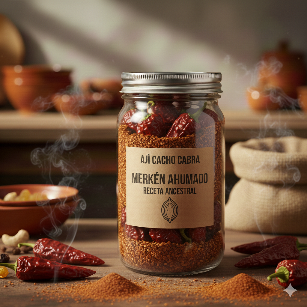 Ají cacho cabra, ahumado con chip madera roble americano, sal de mar Cahuil, semillas de cilantro y de pimienta negra.
